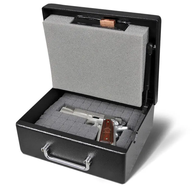 Constructed with 10 gauge solid steel and a formidable 3/16″ solid steel door, this safe features a Simplex Lock for reliable, battery-free access and a punch-resistant housing to thwart the most determined thieves. Its gas piston-assisted heavy-duty door opens to reveal a customizable high-density foam interior, ensuring your firearm and magazine are snug and secure. With pre-drilled mounting holes and a chrome carry handle, the PS1210HD offers versatile installation and easy transport, making it an ideal choice for securing your handgun with confidence.